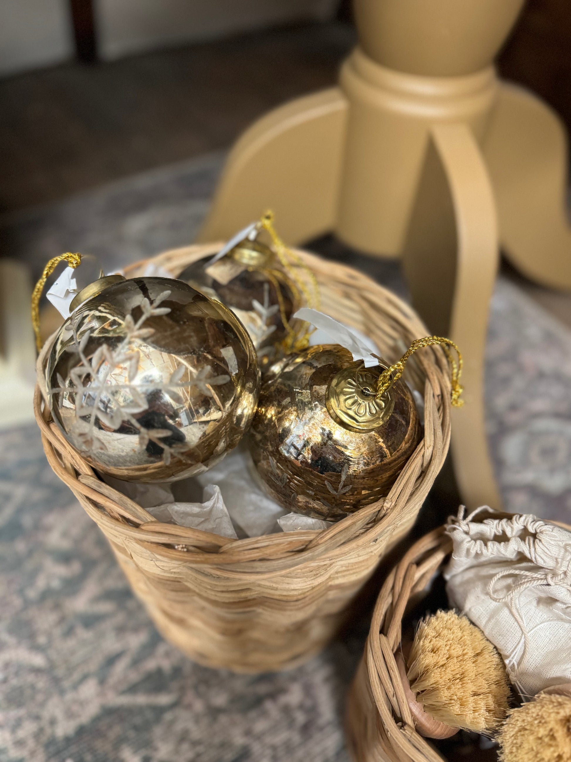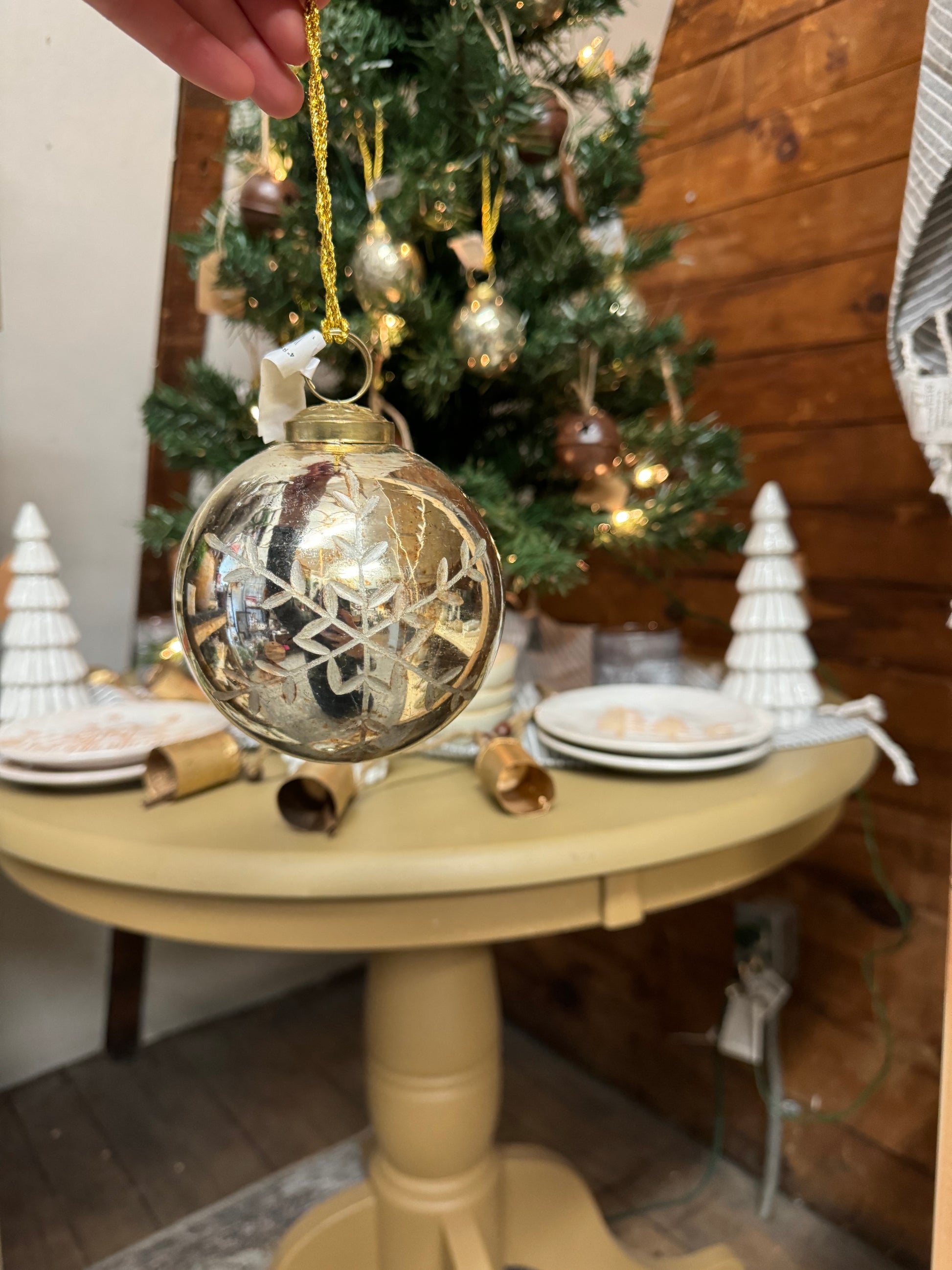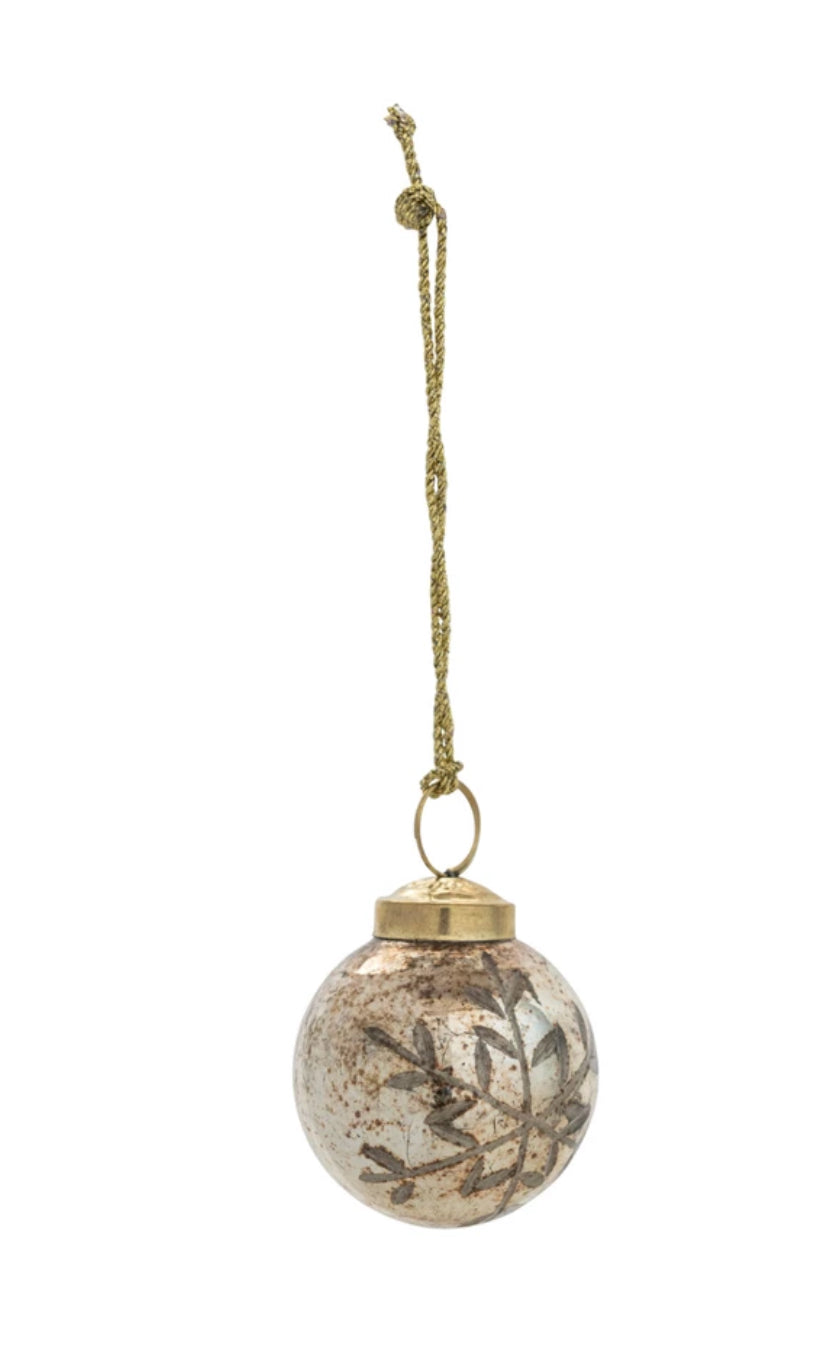 Dimensions: 4” Round Glass Ball Ornament with Etched Snowflake, Antique Copper Finish