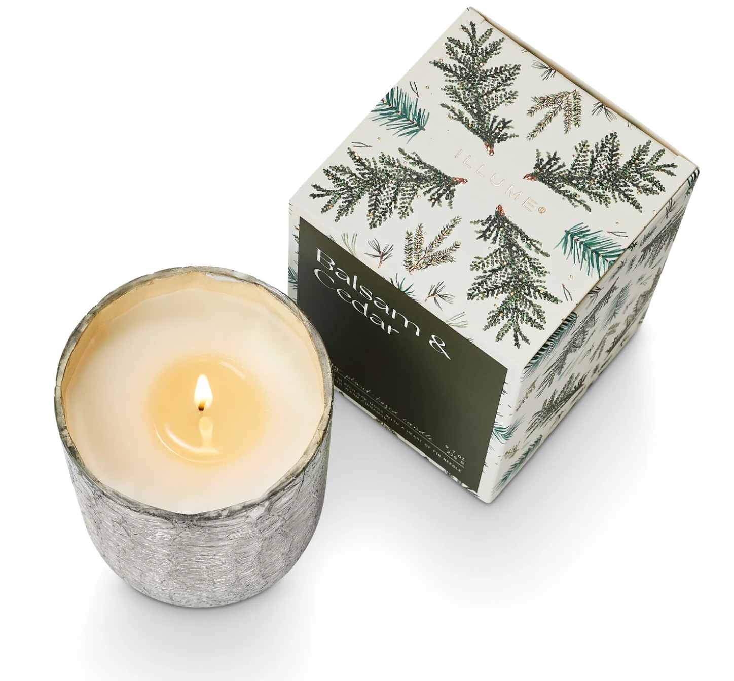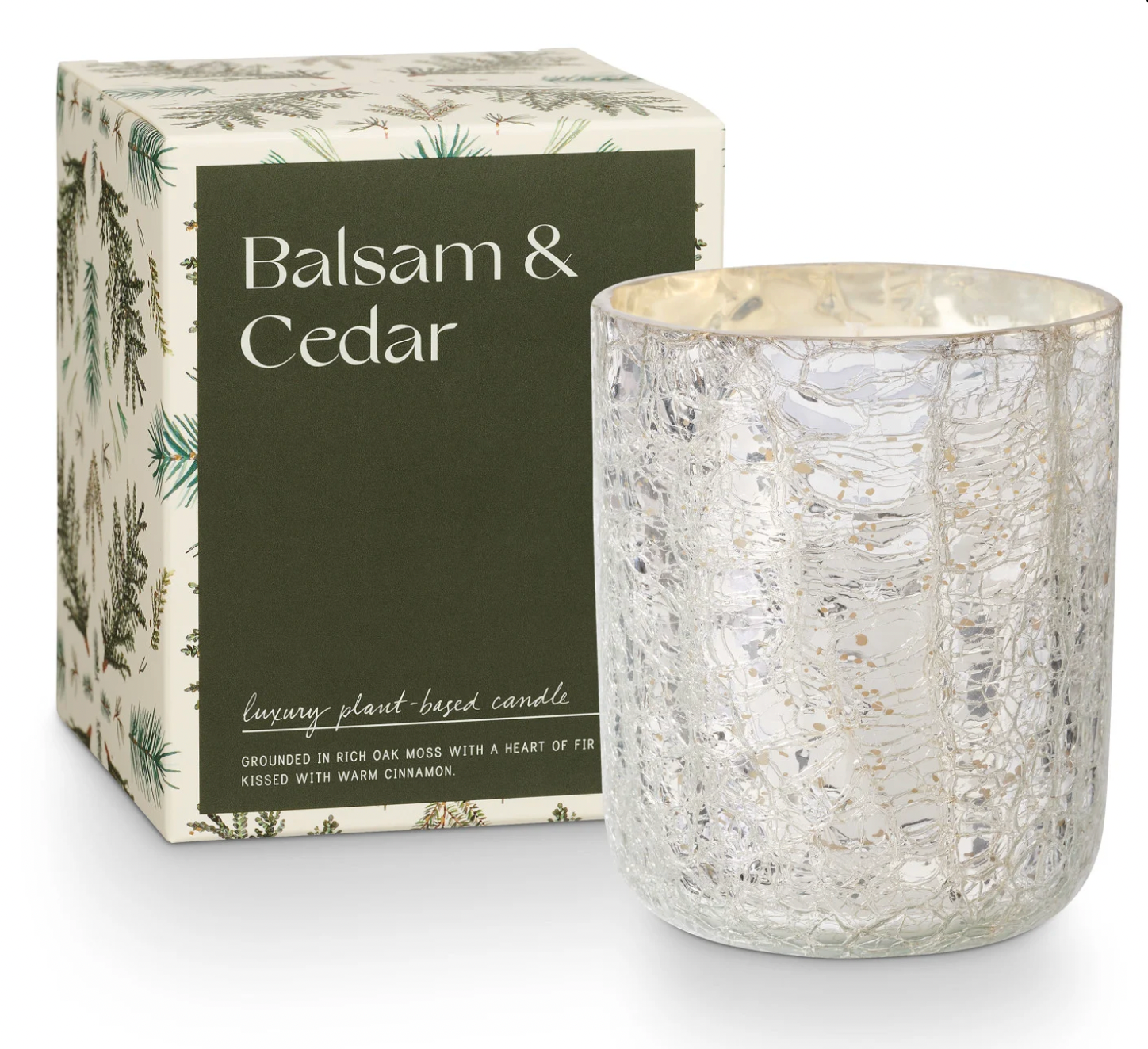 Indulge in the luxurious fragrance of our Balsam & Cedar Boxed Crackle Glass Candle. Our plant-based candle is crafted with balsam and cedar, along with notes of rich oak moss, fir, and cinnamon. Let the warm and inviting aroma fill your space, creating a cozy and sophisticated atmosphere.