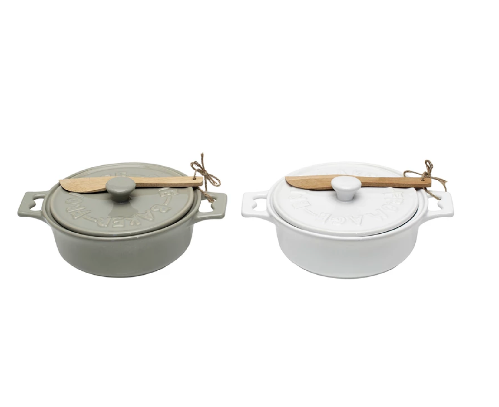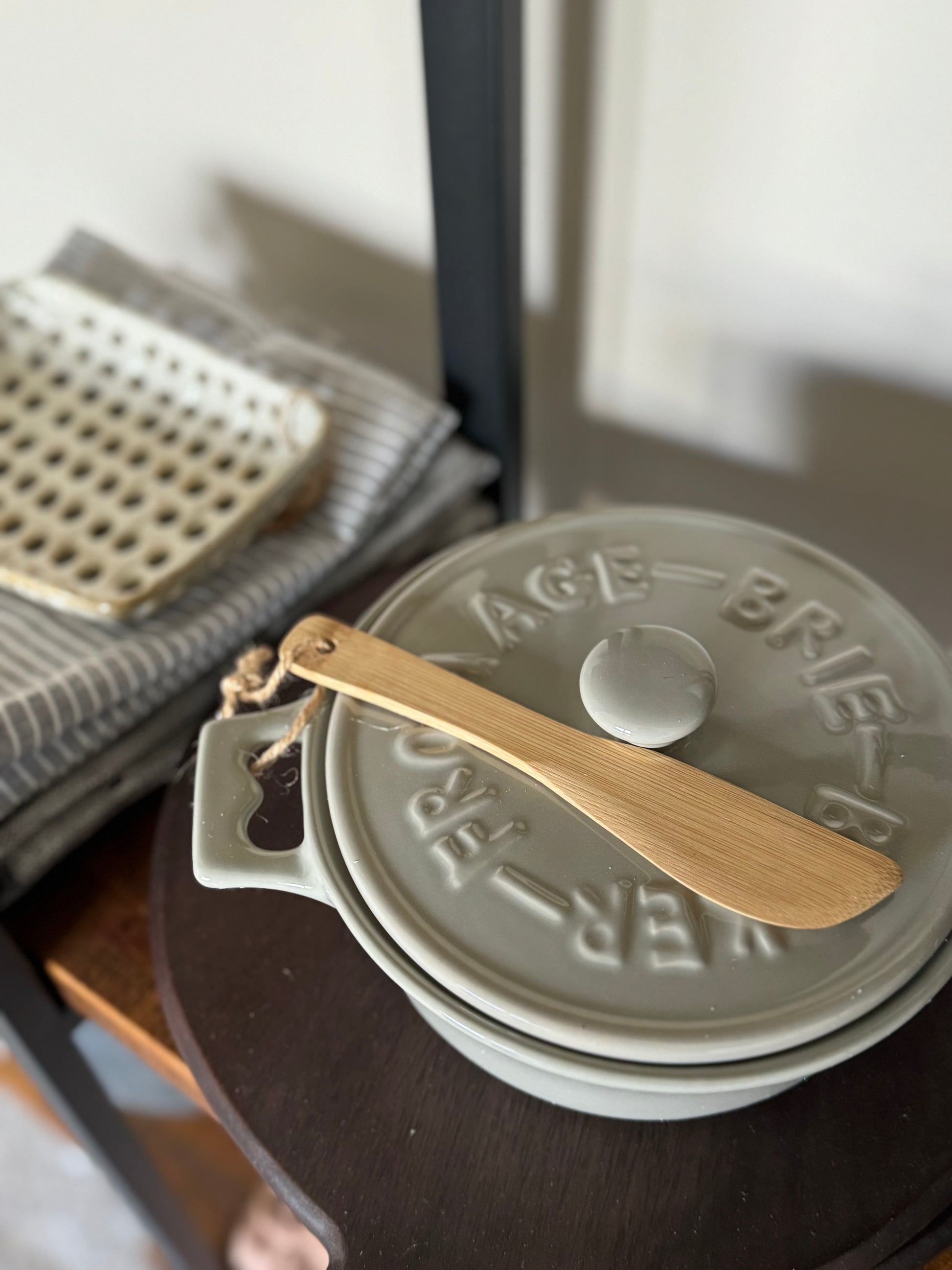 Introducing our Brie Baker, a must-have for elegant entertaining. Paired with a wood spreader, it's the perfect addition to your neutral kitchen decor. Available in two sophisticated colors - white and green - this piece will elevate any gathering. Bon appétit!