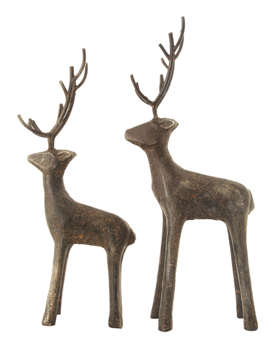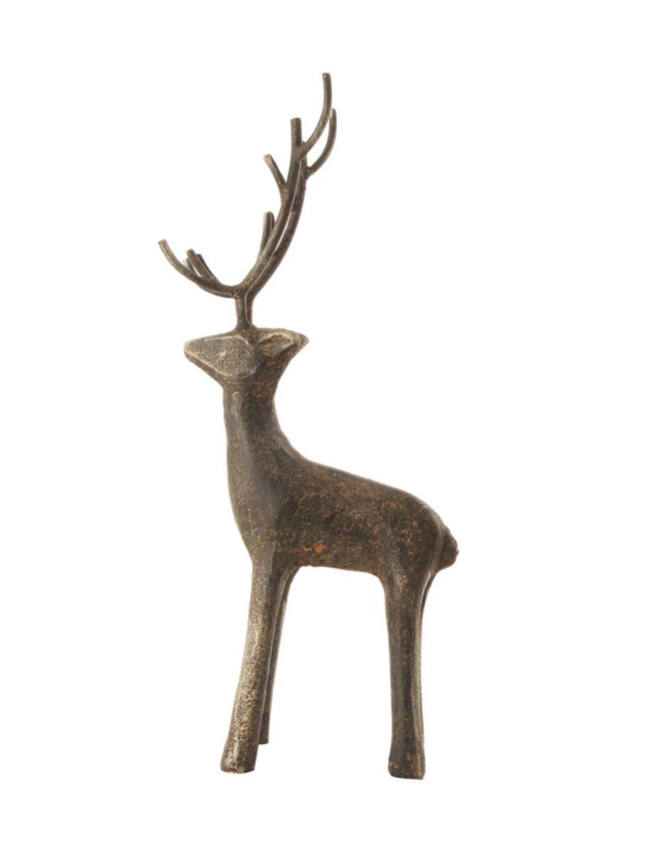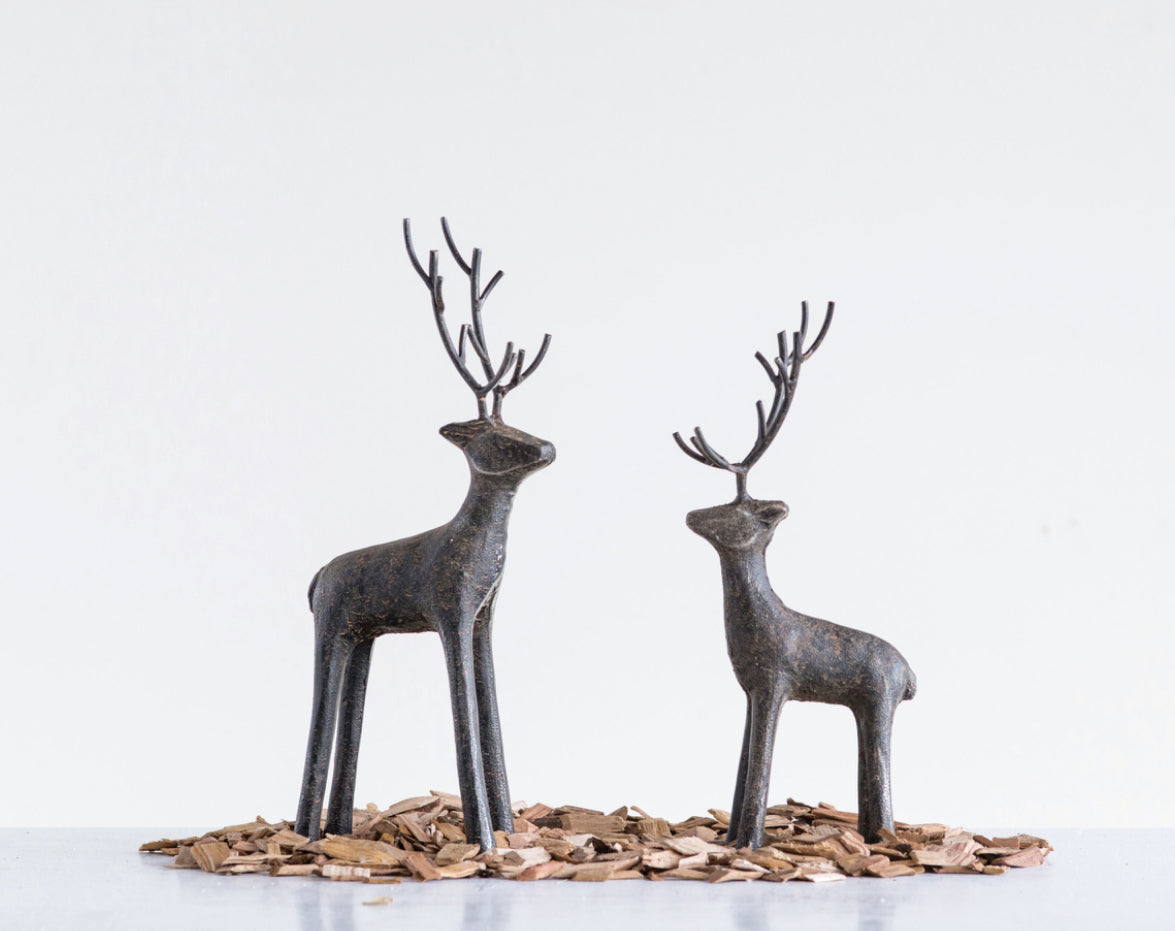 This unique holiday decor features a rustic cast iron deer design, perfect for adding a bit of festive charm to your home. The iron construction is sturdy and durable, making it a long-lasting addition to your decor. Available in two sizes.