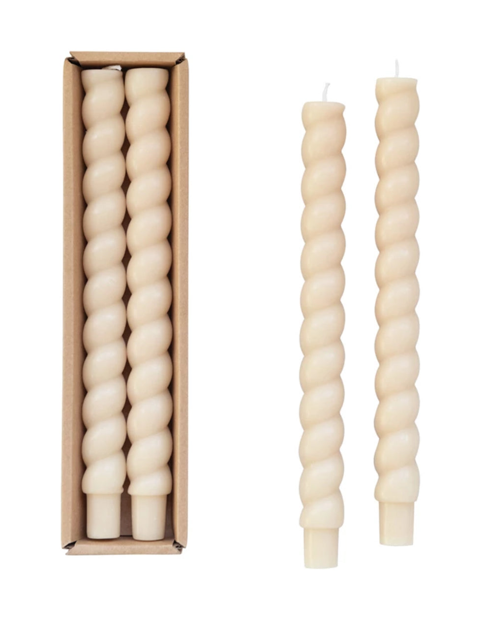 Dimensions: 10"H Unscented Twisted Taper Candles in Box, Cream Color, Set of 2 (Approximate Burn Time 10 Hours)