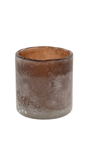 Frosted glass votives feature unique handblown designs, inspired by natural stones, with rims and colors that evoke a cold winter morning. The addition of a flickering candle provides subtle warmth to each individually hand formed vessel, making no two exactly alike.