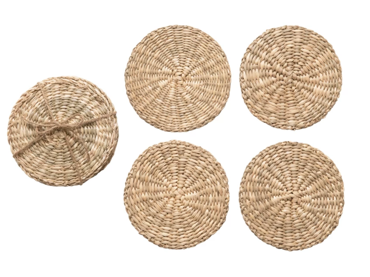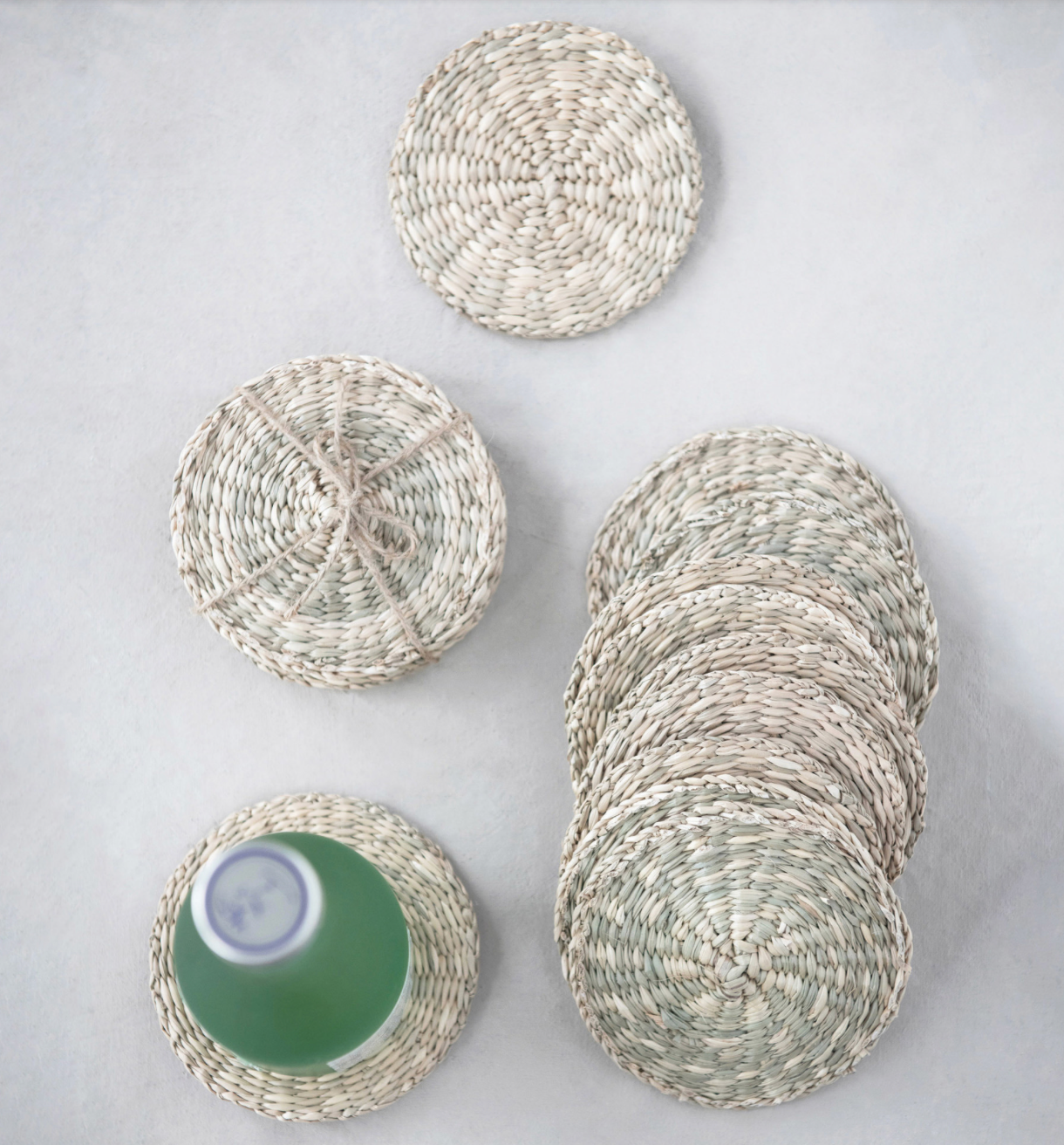 A fun way to add neutral, Summer details to your home. These coasters are hand-woven with seagrass and are sold as a set of 4