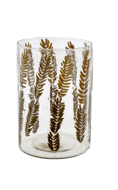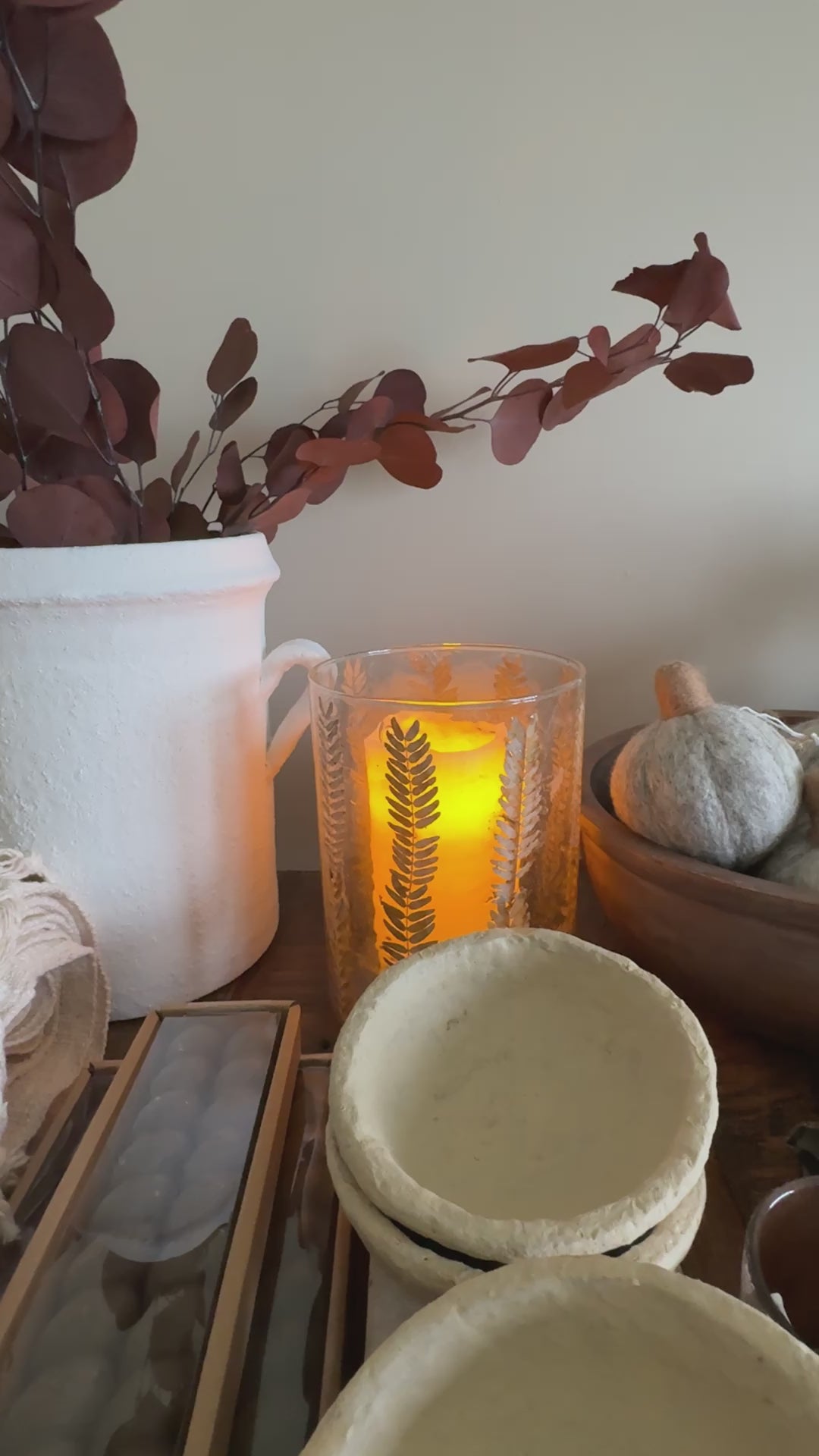 The Pressed Fern Hurricane is the perfect way to add a touch of seasonal flair to your home. Made with pressed ferns, this candle holder will elevate your autumn decor and bring a hint of natural beauty into your space. Its votive style is perfect for displaying your favorite candles.