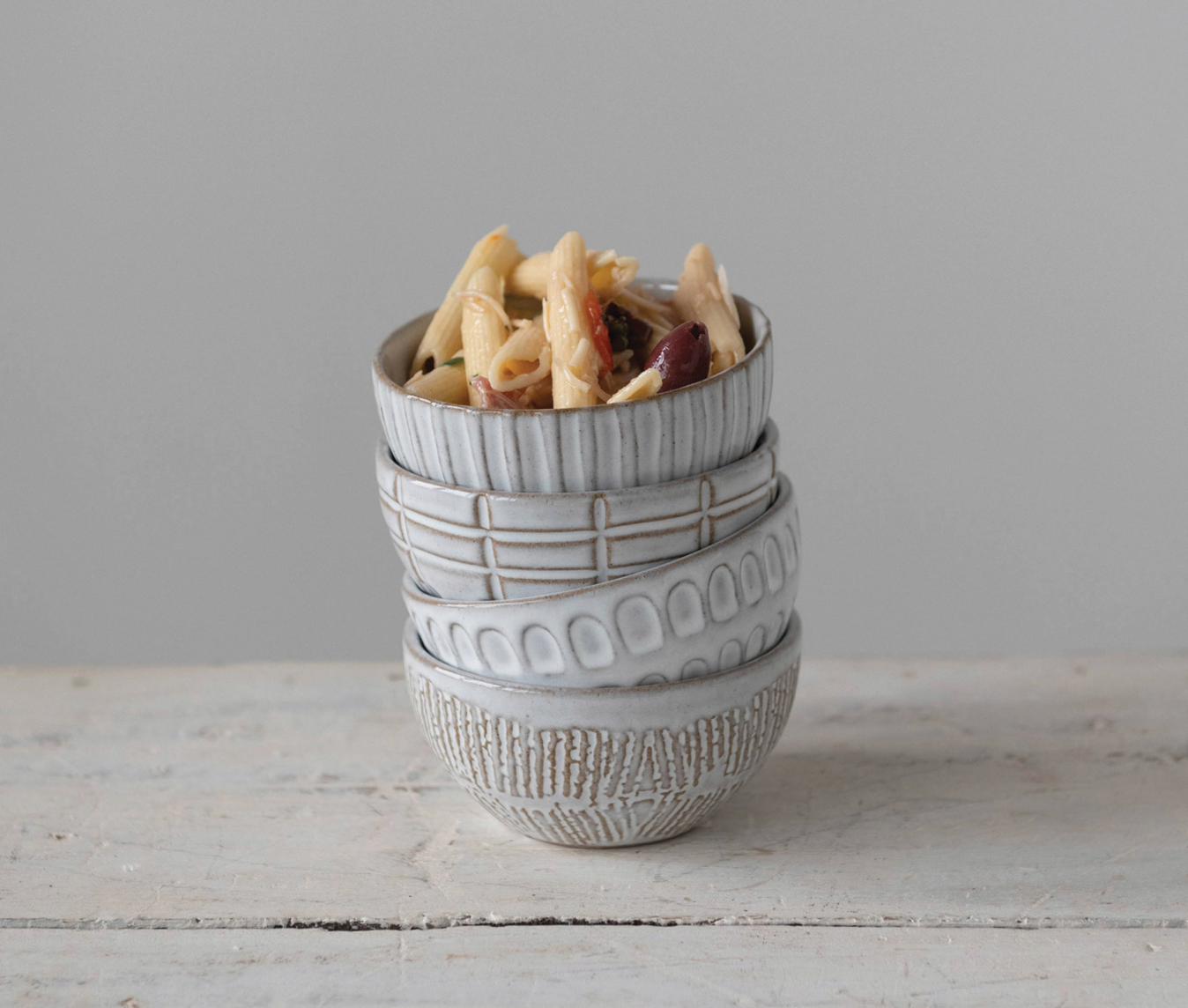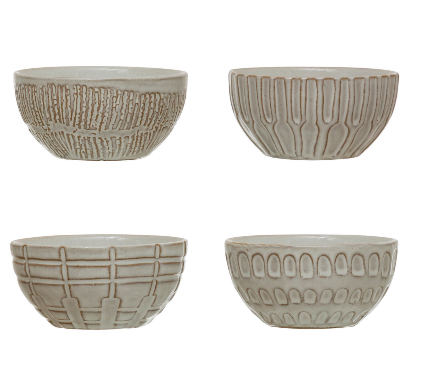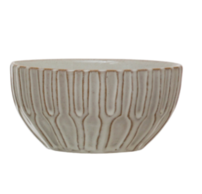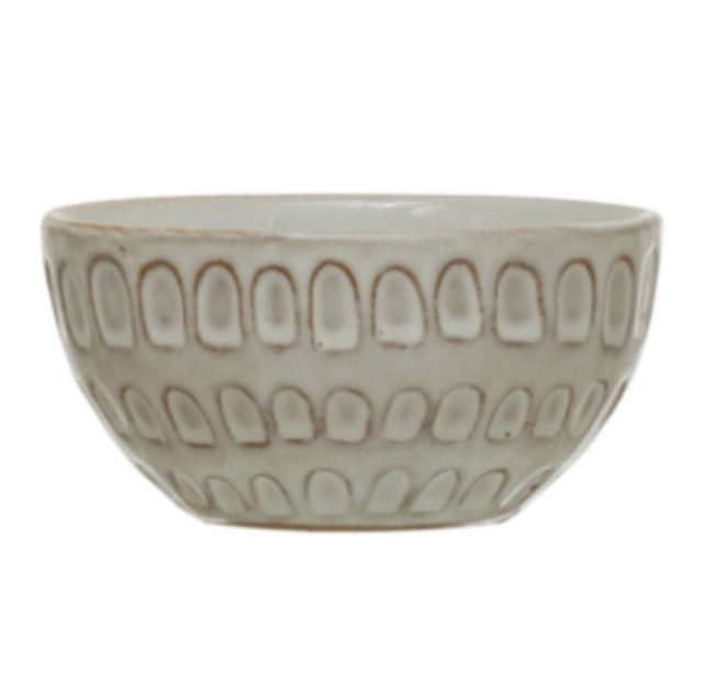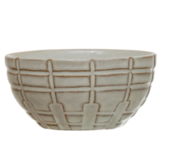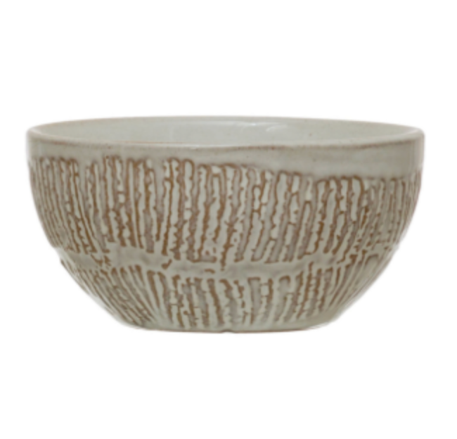 Neutral, debossed stoneware bowl will be a beautiful addition to your tableware collection. Perfect for dips, snacks, and shelf decor.