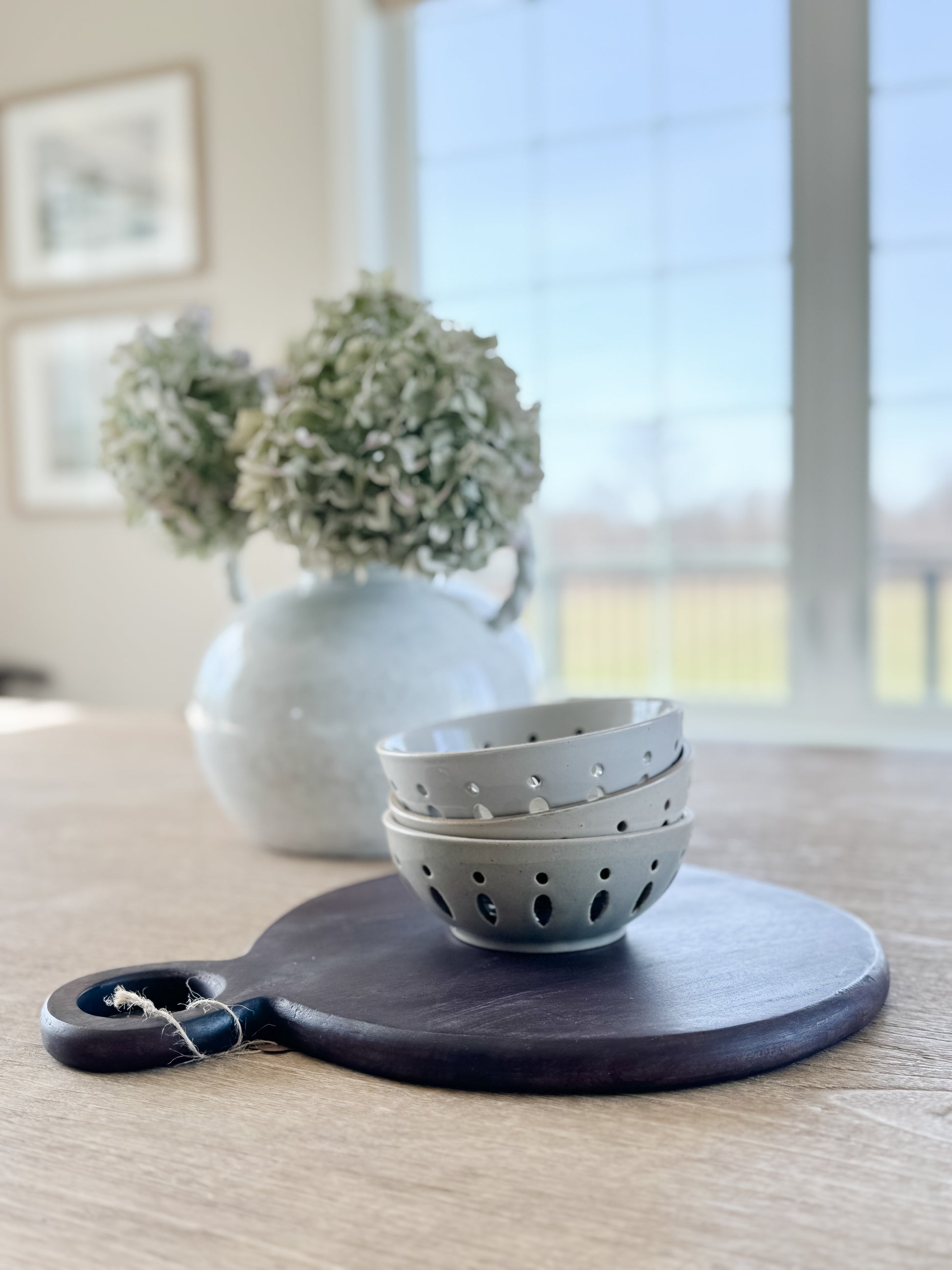This stoneware berry bowl effortlessly combines functionality and aesthetic appeal. Handcrafted with utmost care, it is the perfect addition to elevate the presentation of your berries, while also adding a touch of elegance to any shelf. Perfect for the discerning customer with a taste for both practicality and refinement.