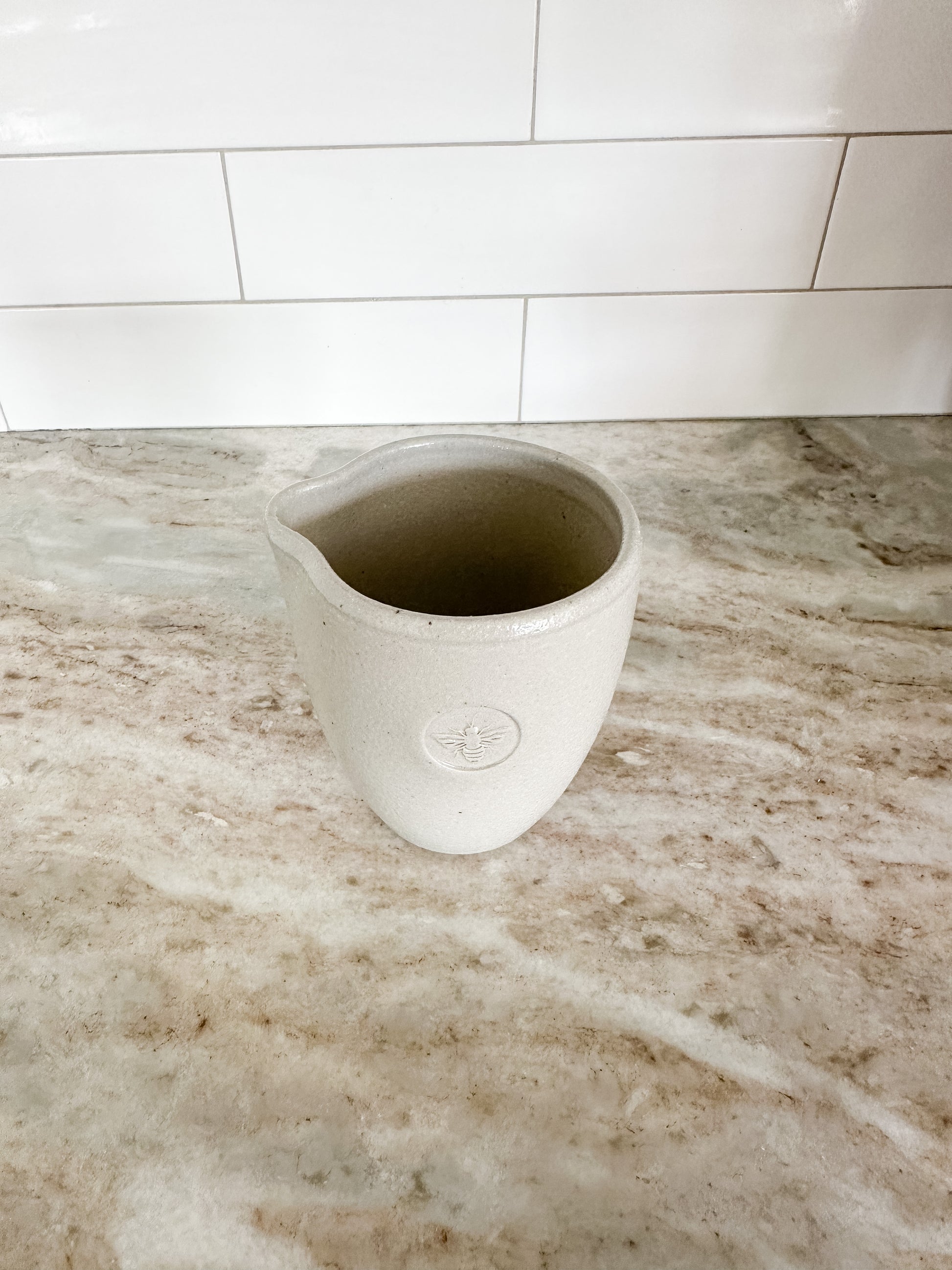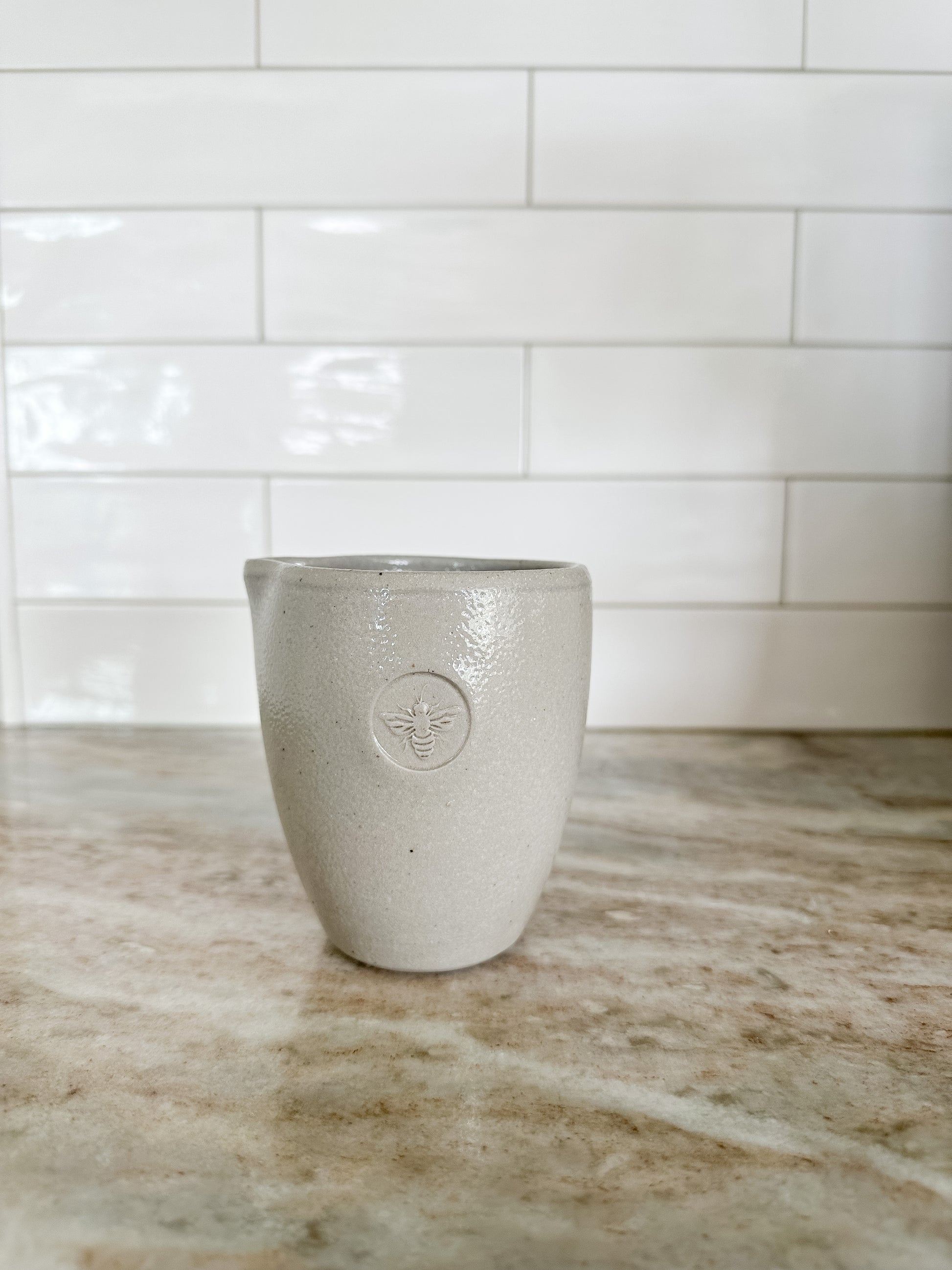 One of a kind, small grey stoneware creamer with pour spout. Embossed bee detail on front.