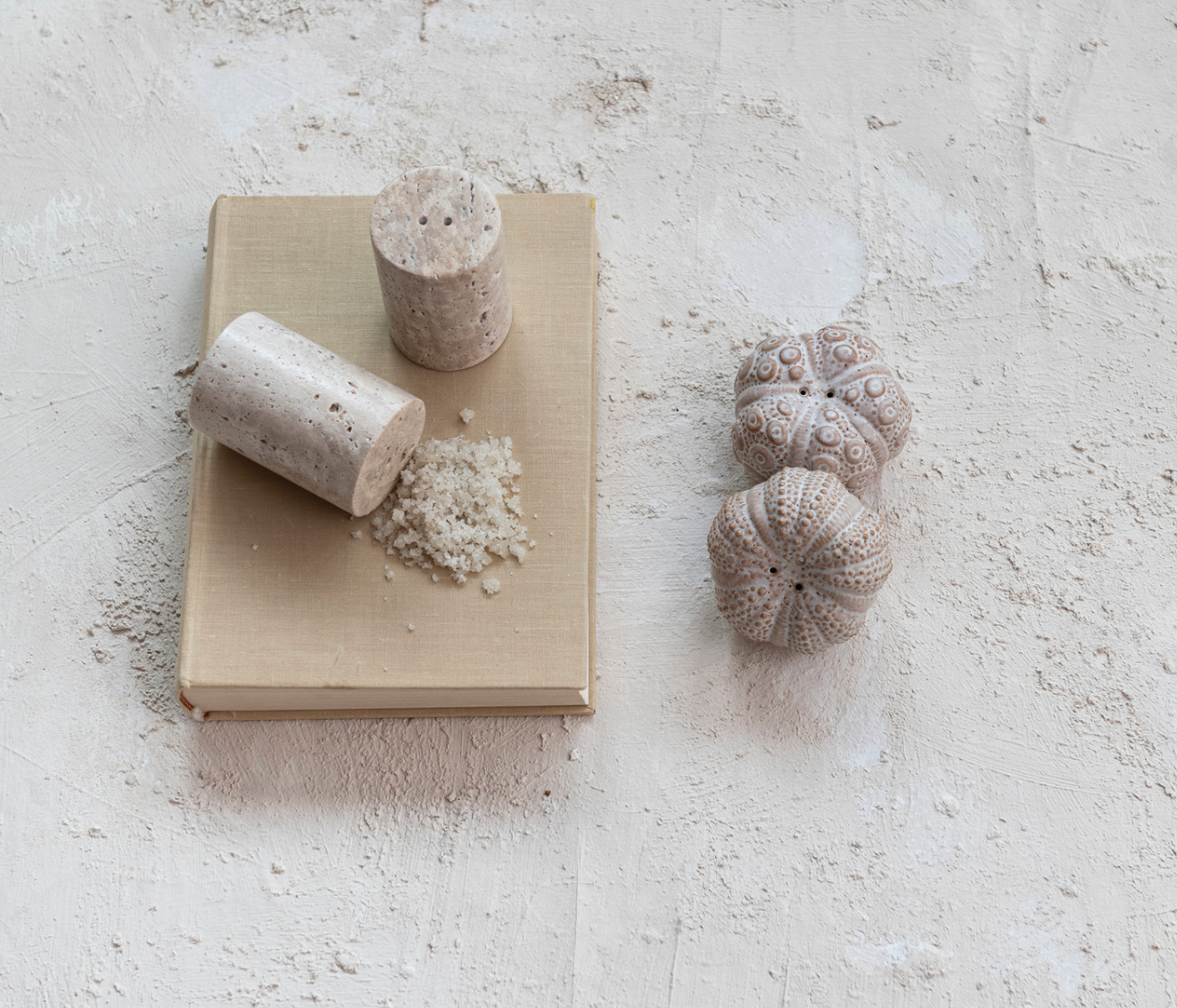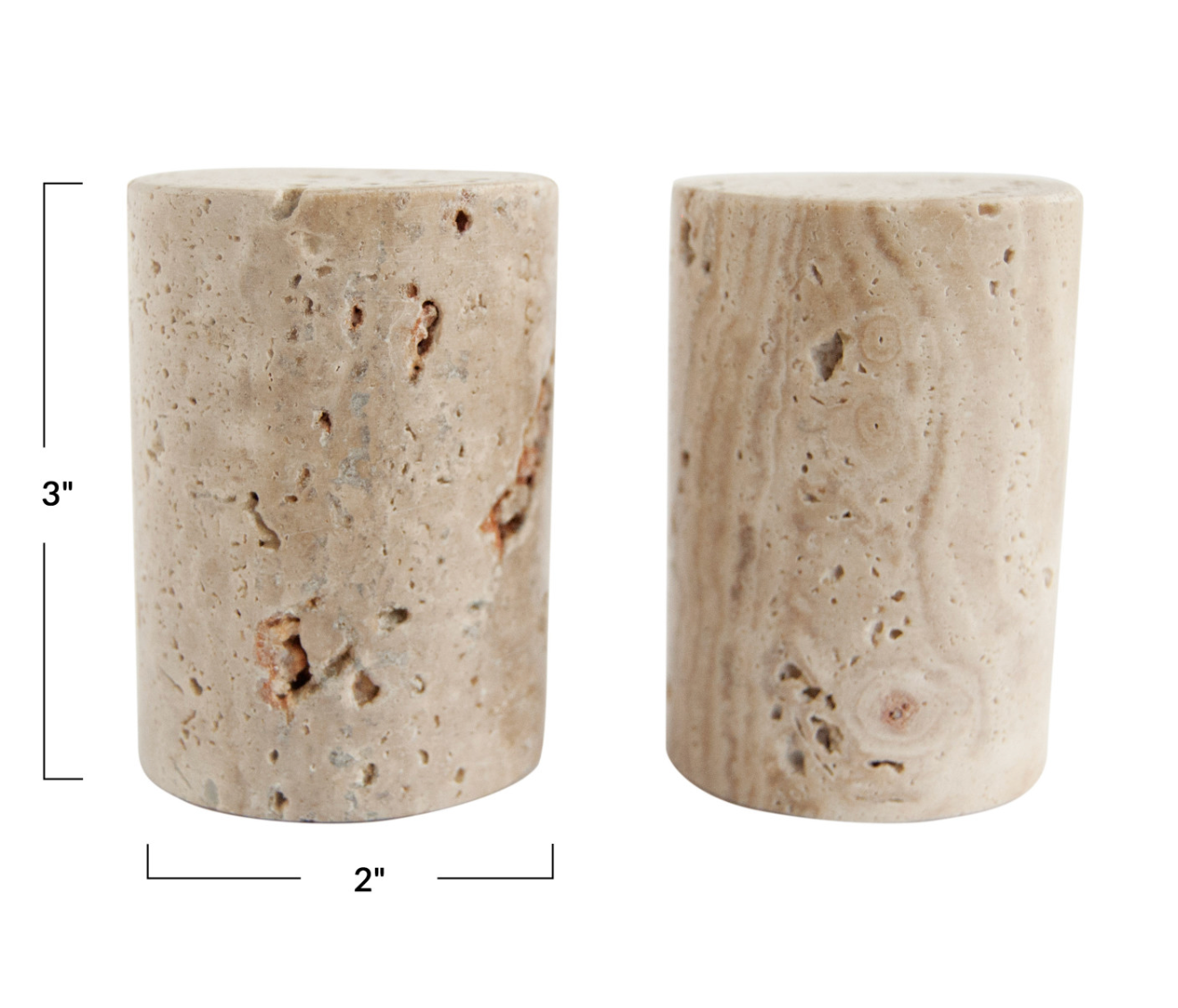 Dimensions: 2" Round x 3"H Travertine Salt & Pepper Shakers, Natural, Set of 2 (Each One Will Vary)