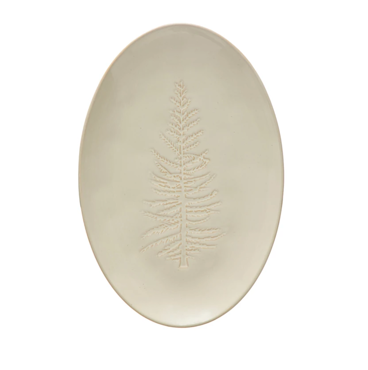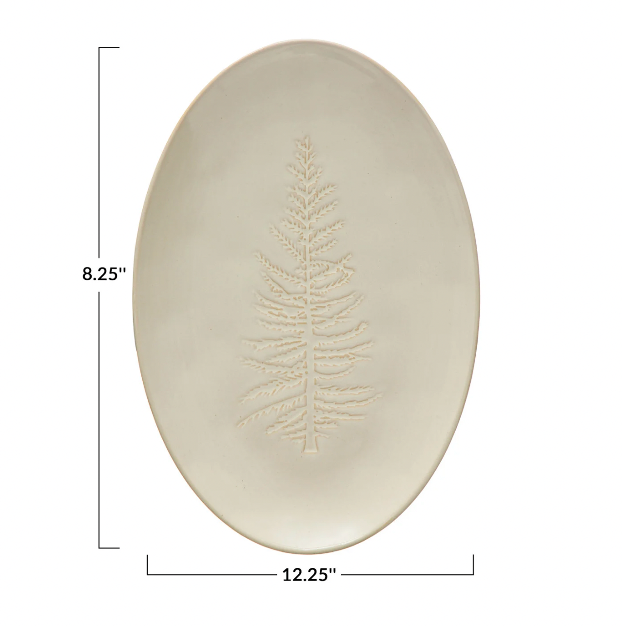Dimensions: 12.25"L x 8.25"W Oval Debossed Stoneware Platter with Tree Design, White